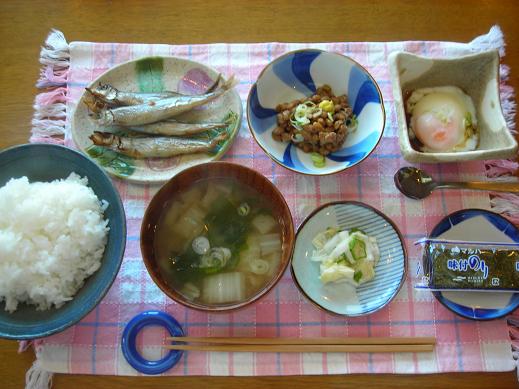 ごはん、みそ汁、焼き魚、小鉢、海苔、コーヒー